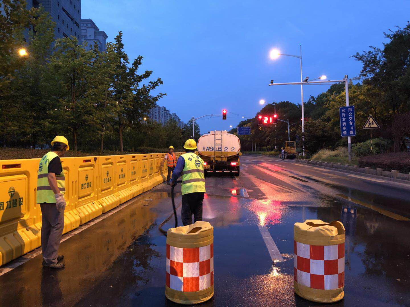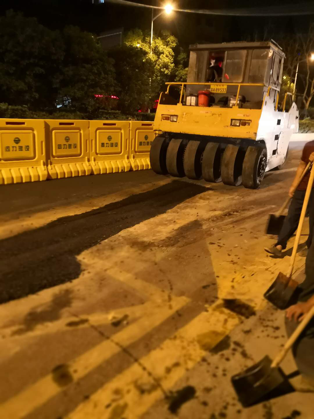 龍?bào)粗新氛沃凶畲箅y點(diǎn)在于承載交通壓力大,施工時(shí)間受很大約束。首先是每日的工作時(shí)間較短,雖前期做了大量溝通工作,但鑒于龍?bào)粗新肥浅鞘心媳毕蚪煌ù髣?dòng)脈,施工容易造成嚴(yán)重?fù)矶?。故最終只能在每日夜間21:00至次日凌晨6:00于進(jìn)行施工,其余時(shí)段均需保證全時(shí)段無(wú)占用通行。在復(fù)雜不利的環(huán)境下,緊抓“定時(shí)清場(chǎng)法”、施“單元施工法”不放松,將整條道大路劃分為十六個(gè)單元以便組織推業(yè)進(jìn)。每日夜間21:00圍擋設(shè)施、施工車輛等陸續(xù)進(jìn)場(chǎng),大批施工人員和交通疏導(dǎo)人員在各個(gè)單元就位,然后根據(jù)現(xiàn)場(chǎng)車流量情況試用圍擋封閉部分車道,并根據(jù)測(cè)試圍擋后車流通行效果靈活調(diào)整車道封閉時(shí)間以及車道封閉數(shù)量,在確認(rèn)不會(huì)造成交通堵塞之后再圍擋施工。見(jiàn)縫插針、統(tǒng)籌協(xié)調(diào)、調(diào)整工設(shè)序,努力做到化難點(diǎn)為亮點(diǎn)。為了確保白天可以順利開(kāi)放交通,提前擬定方案,將小面積難以壓實(shí)、大面積難以養(yǎng)生的水泥穩(wěn)定碎石道路基層處理方案,調(diào)整為小面積用砼澆筑覆蓋鋼板養(yǎng)護(hù)、大面積病害采用ATB瀝青碎石即壓即成型的方案,既保障了交通也保證了質(zhì)量。同時(shí)部署各單元作業(yè)班組集中力量在少量點(diǎn)位內(nèi)施工,開(kāi)一段干一段收一段,不多開(kāi)作業(yè)面,便于控制質(zhì)量和進(jìn)度,同時(shí)方便組織圍擋、開(kāi)放交通及白天的維護(hù)巡查;對(duì)于過(guò)路溝槽、病害處理的鋼板覆蓋措施,也有多項(xiàng)要求及改進(jìn)。首先是確保鋼板厚度不低于2厘米,并在鋼板下放置橡膠墊,減少車輛碾壓的噪音,鋼板四周還會(huì)設(shè)置減速帶起到警示過(guò)往車輛減速以及避免鋼板發(fā)生位移,其次是對(duì)于鋼板下脫全跨度大于1米的增設(shè)槽鋼支撐,并做到24小時(shí)人員巡視不間斷。與此同時(shí),周邊一些單位比較支持,騰出了一些空地給我們堆放材料,這樣在每天早上6點(diǎn)能確保圍擋和施工車輛等就近安放,恢復(fù)快車道交通。